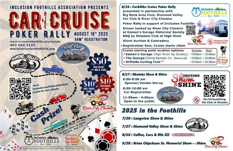 Inclusion Foothills Association, in partnership with River City Classics, Big Rock Auto Club, Diamond Valley Car Club, and Eamon's Garage Historical Society, host the annual Poker Rally Car (and Bike) Cruise. Auto enthusiasts of all kinds are invited to join us for a joyful adventure around the Foothills. Check-in at all of the assigned rally points and get your poker hands punched. Best hand wins! Return to Eamon's Garage for a BBQ dinner and festivities. Classic cars are not a requirement, only enthusiasm.